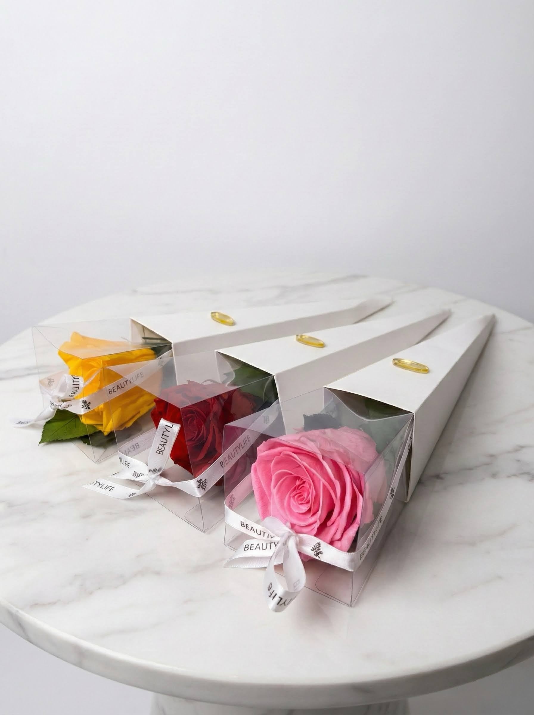 Flores preservadas: Naturales, duran años, no necesitan agua, y simbolizan amor eterno.