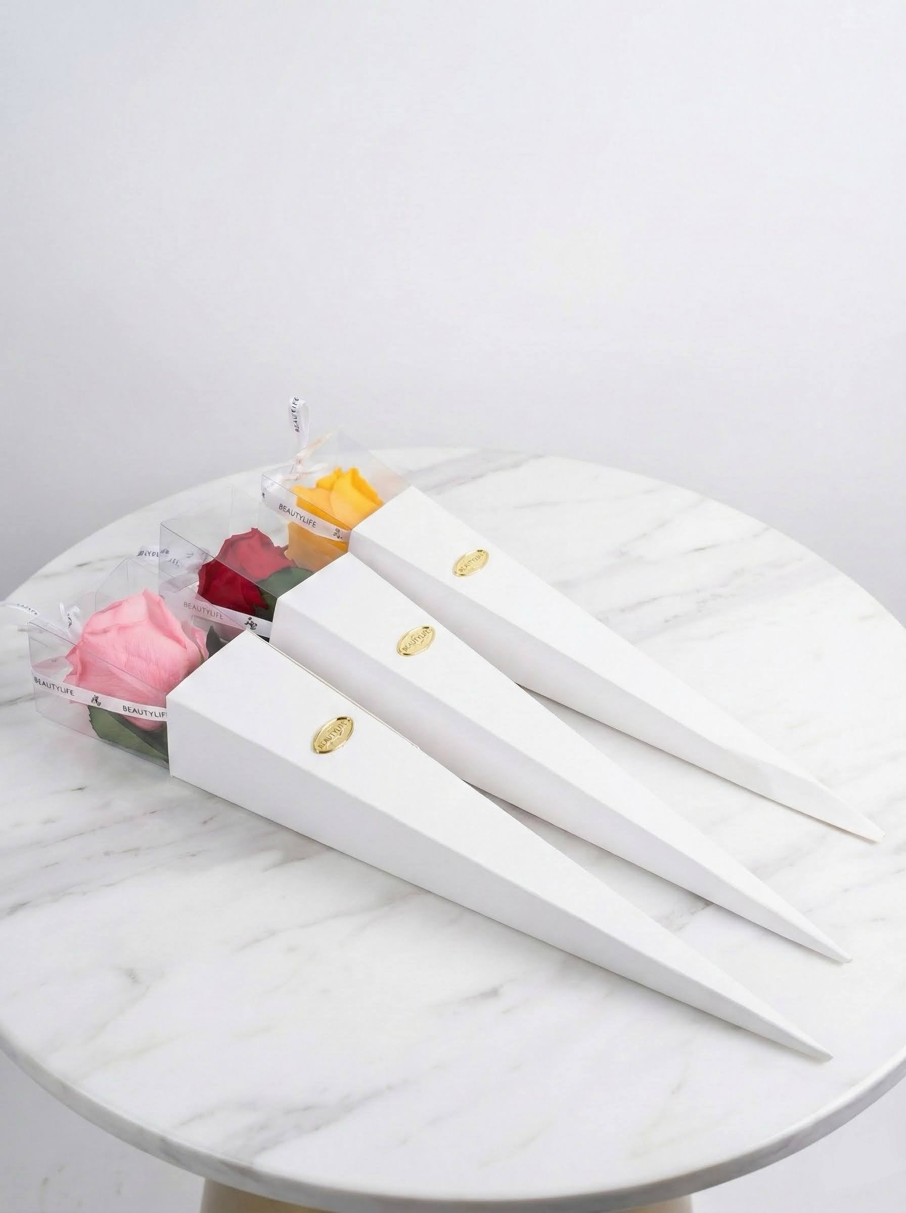 Presentada en una caja premium tipo cono, que resalta la rosa de forma delicada y sofisticada